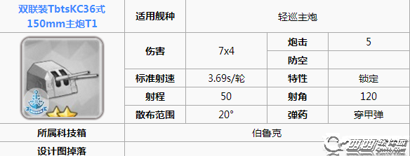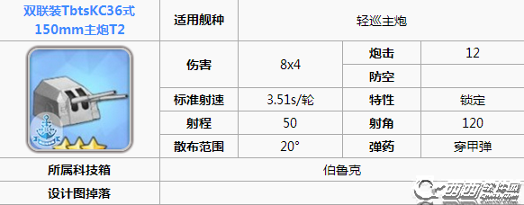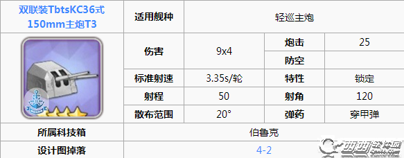 最后一点的小tips:4-2虽然可以打捞这门炮但是概率十分的喜人,建议提督们如果有了4-2的打捞船只时雨之类的选择开箱获得,德国(伯鲁克)的紫色科技箱中就可以开。