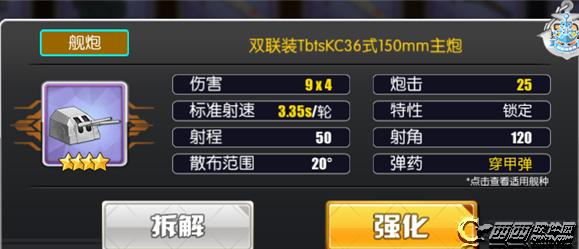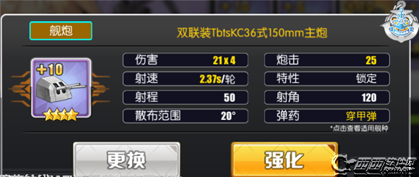 从伤害来看9X4之中的9非常好理解,就是单发炮弹的基础伤害,而这个4则是每轮的炮弹数量6.2日的更新让这门炮彻底翻身打败150单装的原因也是在此,炮弹数量从X2一越成为X4,面板伤害直接翻倍,意味着每一次装填开火发射的炮弹数量是4发,通常情况下这门炮作为轻型炮巡的主炮使用,而轻型炮巡的二破是让主炮底座+1,可以简单的理解成9X4X2,意味着一次是8发,但是这个X2是稍有间隔的。这也是最近疯狂鼓吹的三幻神强无敌的很大一个原因。强化满之后的21X4也表明了这门主炮有着不低的强化成长性,是一件真正意义上的毕业装。