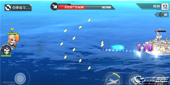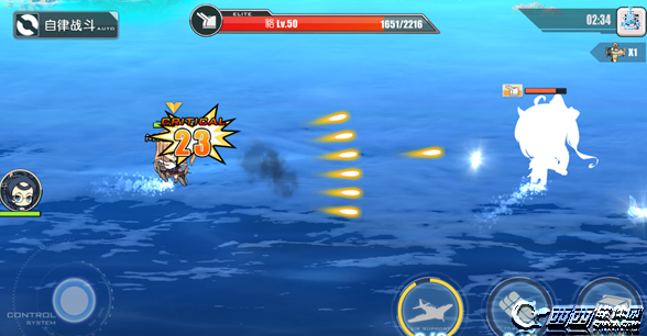 先从射程上来看,很多人觉得射程是一个无所谓的属性,其实也不完全,因为在射程外的炮是不会开火的,射角同理,不开火意味着0输出,不过你游目前还没有射程短到惊人的高输出炮所以体现不出射程的价值,50射程的大概距离就是如下图,超过了这个射程你的克爹就会在屏幕上发呆,这个射程也意味着你如果不是在屏幕正中央是无法处理到还没到你屏幕中的自爆船的,想要利用这门炮清理自爆船必须移动到屏幕正中左右的位置