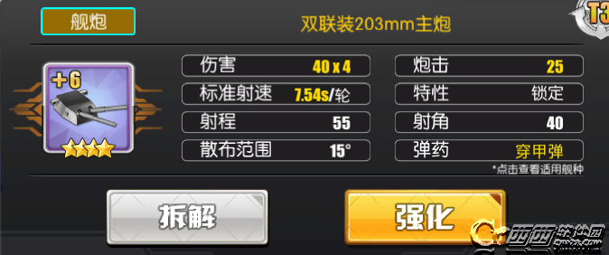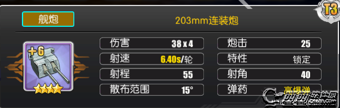 双联装203mm由于穿甲弹对轻甲的劣势,且炮弹数量较少,在射速拉不开优势时,被其他火炮全面拉开了差距,不建议使用。