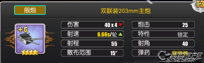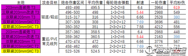 中203mm连装炮、三联装203mm改进、双联装203mm均为T3,双联装203mmSKC由于4星为T2,所以同级测试时是用的T2,当然因为还存在5星的T3级别,所以也将其加入了测试列表。