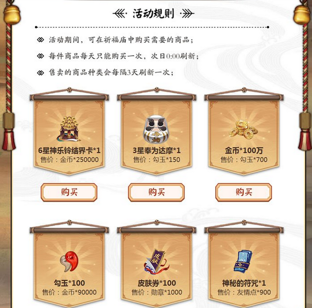 可在祈福庙中购买需要的商品,每件商品每天只能购买一次,次日0:00刷新,售卖的商品种类会每隔3天刷新一次。