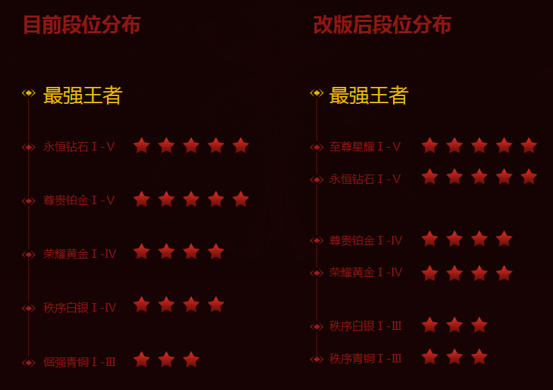 同时,铂金阶段每个小段位5颗星将会将至4颗,白银每个小段位4颗星会降至三颗,铂金的5个小段位划分也将将至4个小段位。