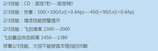 干将莫邪2/3技能的飞剑射程、速度、伤害被下调,同时还增加了1秒CD和技能警示,此次调整后降低了POKE能力,对手通过走位避开的成功率有所高,但这也并不代表干将就此残废,他依然能在后排提供高额的伤害和牵制。此次调整后还修复了2/3技能不被宫本武藏1技能抵挡的BUG。
