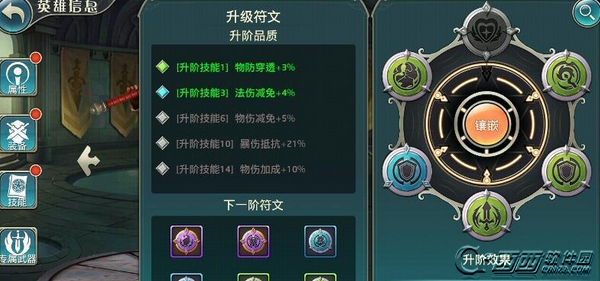 每一阶的提升都需要不同的6个符文去镶嵌,镶嵌6个就可以进阶了,除了镶嵌符文或者进阶的同时获取到战斗力提升,在进阶达到1,3,6,10,14阶的时候,还可以获取到升阶品质的更高属性增加。只有提升更高的等级,开启更多普通关卡才可以进阶更多