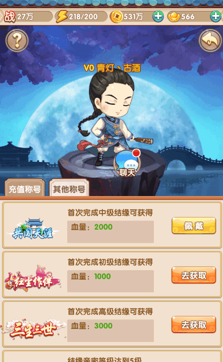 游戏中的称号是增加属性的,这一点需要说明一下,分为VIP称号和结缘称号,加的属性可有可无,但称号人家本来就不是专门用来加战,最重要的还是一种象征,一种荣誉,一种见证!