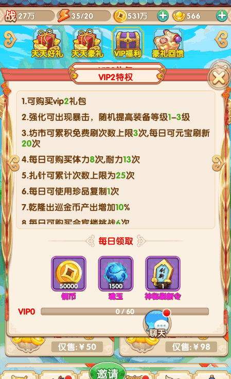 说到VIP,这个就厉害了~这里的话如果长期玩的小伙伴,建议有条件的可以开个月卡,绝对不亏!月卡一月30元,于此同时可以将VIP等级升到VIP2,一天送一百元宝和很多道具,再加上每天送的一个体力丹,每天可以比别人多4个体力丹,也就是120点体力,除此之外还有很多其他的特权,可以说性价比非常高,足以奠定一些优势~