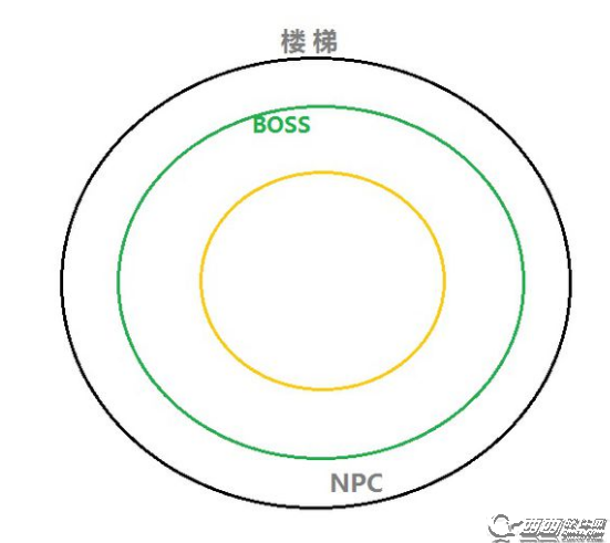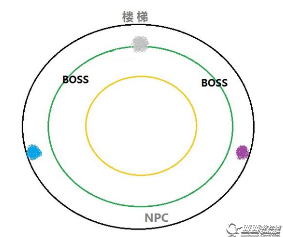 1、阶段开始前,BOSS所在位置,最好为上图标记的两位置之一。可以有效避免BOSS的“屁”在跑圈阶段的干扰,也可以方便大家将视角转到楼梯方向,防止懵逼。