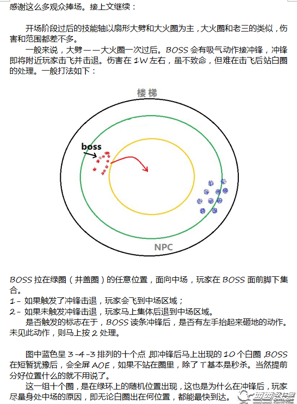 3、出标记后,所有人不惜一切代价迅速跑圈,此时BOSS身上有免伤效果,贪输出意义不大。什么被BOSS活活AOE死啊,什么站圈里出火雨啊,都是因为一个事——跑圈慢所以你懂的。放心,只要全团跑圈足够快,即使你的组里没有治疗,只需要喝一瓶血药,也可以抗到触发动画。