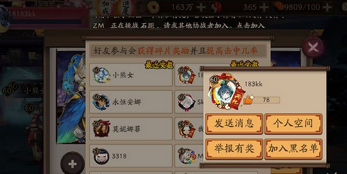 操作方式:点击用户头像,在世界频道、好友栏目、百鬼碎片点击就会显示如图。