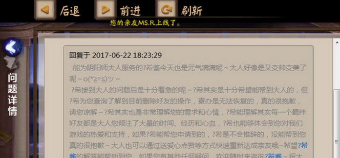 不小心误点了这个,反馈给客服,得到的回复是寮办无法恢复。所以,阴阳师黑名单功能使用要慎重,可能一不小心就删除好友,并且自动清除好友羁绊关系。。
