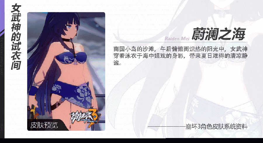 适用于所有芽衣角色,泳装设计非常符合「蔚澜之海」的名字呢!「蔚澜之海」将在休伯利安夏日祭活动中开放获取,该活动即将于近期开始,喜欢芽衣的舰长可要做好积极参与的准备了哦~
