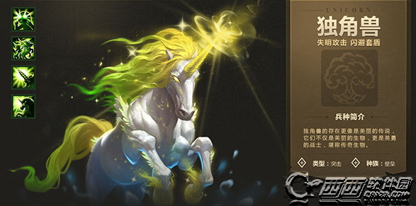 独角兽闪避值提高100,每有一个己方突击兵团上场,独角兽闪避值额外提高40。