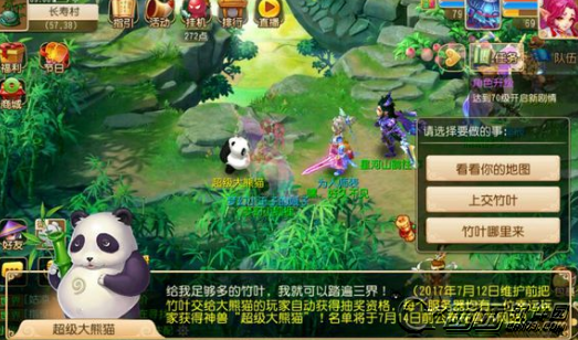 2017年7月12日维护前将竹叶交给超级大熊猫的玩家均自动获得抽奖资格,每个服务器均有一名幸运玩家获得神兽“超级大熊猫”,名单将于7月14日前公布在官方网站。