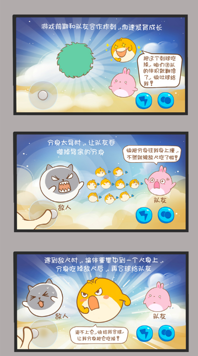 1.合作炸刺,当自己的体积比刺球大的时候,就可以呼唤小伙伴一起愉快的炸刺了,如果遇到刺球就勇猛地往上撞!这时候会分裂出很多分身,然后呢让队友快速的吃掉分身,你会神奇的发现队友的体重在蹭蹭得上涨哦,扎刺越是早越是能让小队在前期取得优势哦!