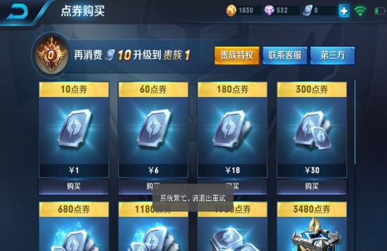 (1)有部分安卓微信大区的召唤师在充值时提示“系统繁忙,请退出重试”(如下图),对此问题我们已经在紧急处理中,当前如果有遇到该问题的召唤师,可以将游戏进程杀掉后重新登陆游戏尝试充值。