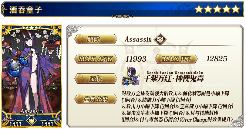 酒吞的出现弥补了暗杀阶缺少强力光炮的空白,由于没有宝具本,其宝具输出能力暂时不能与顶尖从者比肩,但仍有着不俗威力。并且由于其宝具卡色为蓝色,可以进入蓝卡队,在队友辅助下可能实现光炮连发,与其2技能具备的3回合宝具威力buff能很好地契合。除了这一buff以外,酒吞的其他输出辅助技能均能对全队产生增益,包括技能的降防加攻与宝具副效果的降防,虽然自身输出不算顶尖但能对队友产生相当于30%~50%的攻击力buff增益。除了输出辅助能力之外,酒吞的宝具还具有其他多种多样的debuff效果,其中3回合的攻击力debuff与1回合的技能封印价值较高,其他效果由于幅度较低实用性不大。