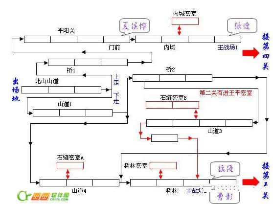 密道山道1(要第二关有进王平密室):第一画面,这里主要的是一些箭兵、刀兵。一进来大家最好先用6c。然后,有两种攻法:1是6c后就直接冲,打掉护栏。2是6c后就走到最上或最下面,等清完刀兵再向前攻。第二个画面,在桥上有火箭车,只要大家靠桥的最上、最下方走就没事了。走到桥尾就会有鹰。尽量先把鹰给解决了!!打完之后再过去就会有石头掉下,还有箭兵在射箭。只要站在桥的最下方就没事了。之后就会有铁甲兵和铁甲马。应该没什么问题。