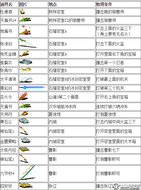 注∶物品后之数字为碰撞次数,有「*」者则是2 PLAYERS 以上时才有!