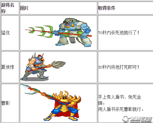 孟优、曹彰:这是个低智商的蛮族魔王,所以只要坚守从其背后进行攻击的原则,和不要让其跑出画面外就可以轻松获胜。但是孟优血表剩一半时,曹彰会出来增援,曹彰出场时不要站在画面的正中间,以免遭池鱼之殃。 双魔王在场时,必须各各击破,尽快把孟优打败,以免受到魔王两面夹击。曹彰倒地起身时要小心,且防御其攻击时需要马上反击。