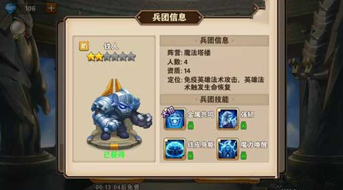 铁人作为魔法塔楼兵团唯一的防御兵团,他的防御能力是非常强的,不仅能够免疫英雄法术攻击,技能还能进一步加强防御,如果使用得当,完全能够弥补无法触发生命恢复的弱点。