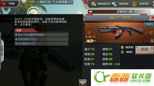 AK47-ss的升级版本,在继承原有武器系统优良性能的同时,加装下挂式散弹枪配件,火力更猛!