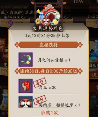 阴阳师文月运势包性价比:作为俗称的月卡,在2017年增加了新的头像框的奖励,基本都是限量版,勾玉除外,其他两个加成是非常可观的,如果想要长期玩的话,建议入手。