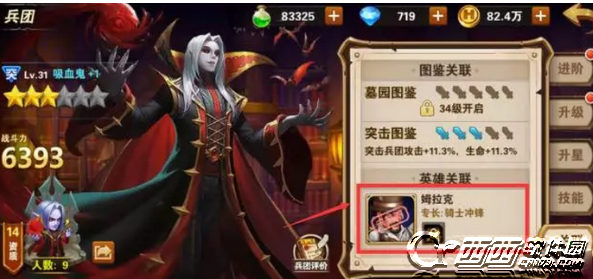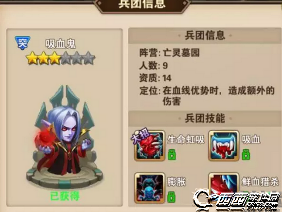 效果:吸血鬼兵团对较大范围内随机一个敌方兵团造成656伤害,并吸收328生命(随技能等级提升)