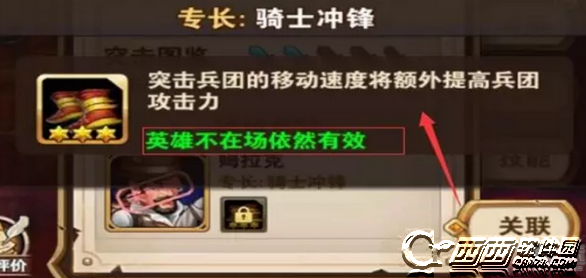 效果:突击兵团的移动速度将额外提高兵团的攻击力(英雄不在场依然有效)
