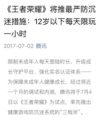 “《王者荣耀》上线以来,受到了广大用户的欢迎。与此同时,我们也关注到,如果青少年缺乏足够的自制力、不合理分配游戏时间,也将影响他们的学习和生活,”《王者荣耀》开发团队有关负责人表示,“游戏本身是带来快乐的,但过度游戏无论对自己还是家长,都不会带来快乐,因此我们希望采用更加严格的措施。”