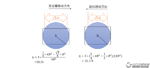 矩形是敌机通过的路线,上下两端是理论上由于射速过慢不能击落飞机的区域,称防空圈失效区,百分比是失效区占防空圈面积的比例。