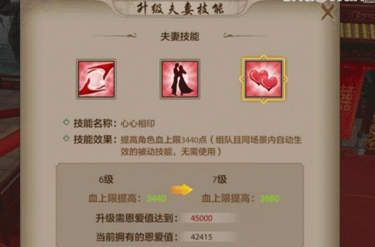 结婚后的三个技能,需要夫妻双方的恩爱值进行升级,每天夫妻双方一起组队参加各种活动,可以获得恩爱值,提升技能可以增加技能的强度。获取恩爱值后,可以到洛阳找到NPC喜娘处,进行提升技能。