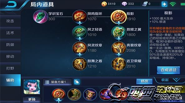 装备解析:极影是强化团队输出最优秀的辅助装。周围的友方英雄能获得大幅度攻击速度加成,尤其是射手的输出能力能获得质的飞跃。即使攻击速度对友方英雄收益不大,高额冷却缩减也能提升技能输出的伤害。不过极影保护效果并不出色,因此需要本身保护能力出色的辅助才能驾驭。推荐辅助英雄有蔡文姬、大乔、鬼谷子。尤其是蔡文姬,因为保护队友的能力非常出色,且一般都处于团队中心位置,极影增强输出的能力可以发挥地淋漓尽致。