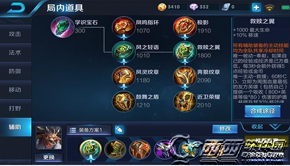 装备解析:救赎之翼是最常用的辅助装备,其优点在于强大的单体保护能力。能为周围血量最低的友方英雄提供一个高额护盾,并增加其移速。实际团战中,血量最少的一般就是我方被刺客切入的射手。一个及时的救援能让射手不被秒杀,同时增加的移速让其能迅速找到安全位置继续输出。此外,救赎之翼非常适合充当前排的辅助英雄。有时候即使周围没有队友,给自身套上一个护盾并增加移速,也能方便追杀和逃跑。救赎之翼是非常万金油的辅助装。适合英雄有牛魔、庄周、太乙真人。