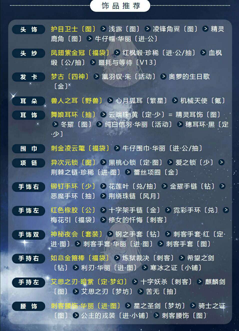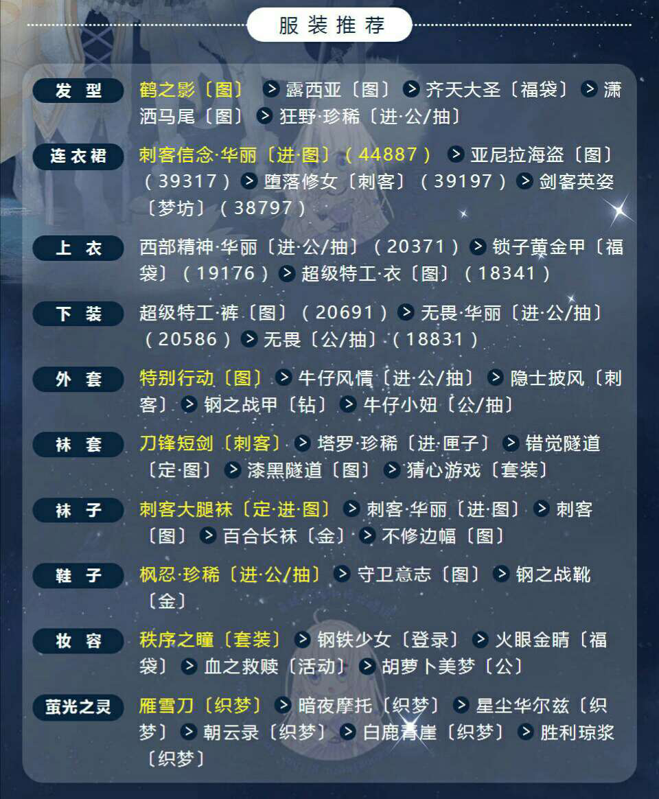 没有图上衣服的小伙伴,试着用配装器补一下 ,选关卡、下方找相应部位、看排序就行有侠客联盟标签的饰品,能带多少带多少,进行搭配时善用标签搜索!今天的(并没有什么用的)猪队友选华丽性感的~