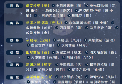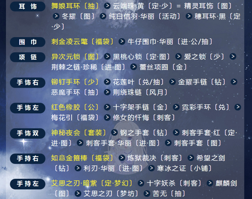 今天的搭配比较……贵重没有图上衣服的小伙伴,试着用配装器补一下 ,选关卡、下方找相应部位、看排序就行饰品缺很多的,就只带9个饰品~