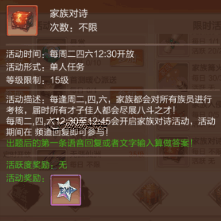 九州天空城3D家族对诗是智力答题玩法,家族对诗答题每周二四六12.30开放,九州天空城3D家族对诗答对题目越多奖励越丰厚,那么九州天空城3D家族对诗答案有哪些,西西带来家族对诗答案汇总一览,希望对大家有所帮助。