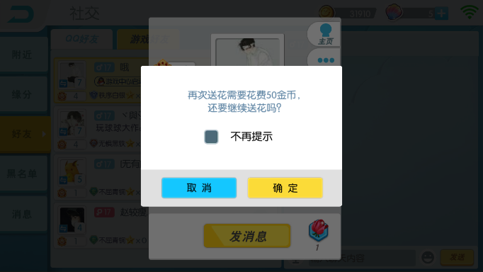 点击右下角即可免费送花,第二次送就要花50金币啦!