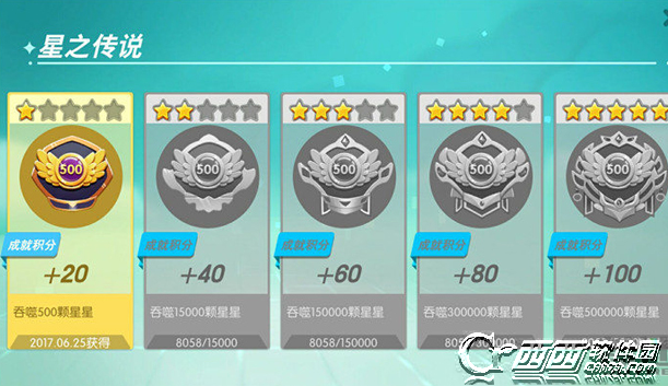 在欢乐球吃球游戏中,每一个成就都是分级的,基础成就分为五级每一级一颗星。每一星的要求都不同,奖励的成就积分也不一样。不过在游戏中,成就积分可以叠加领取,比如我们直接获得了两星成就,那么成就积分奖励可不是只是四十分哦,而是六十分!