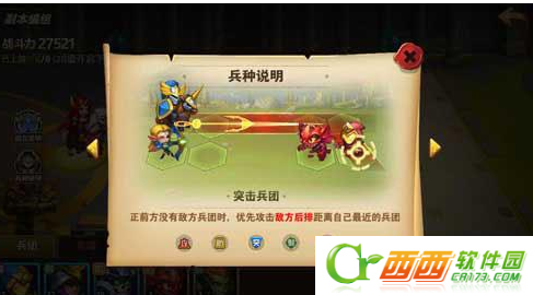玩家在排兵布阵的时候可以打开兵团说明来查看5种不同类型的兵种,各自的攻击特点,然后根据他们的特点来进行布置。每场战斗敌方的布阵规则都不一样,我们需要根据敌方的布阵,来扬长避短的布置出我方兵团的位置,整场战斗都非常有策略性。5个类型兵团的攻击特点分别为: