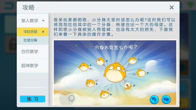 让体积小一点的队友躲在自己身体下面,不要漏出来(ID也不要太长了),对手如果想来吃你,此时队友站出来,吐球给自己,可以瞬间完成反杀。同理也有躲在刺球下面的,角落里的,都是同样的道理。