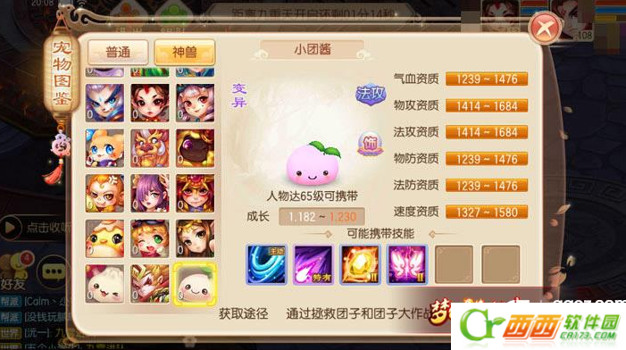 小团酱虽然在图签中位于神兽一栏,但它并非神兽:只是变异宠物而已,所以不论是属性资质还是成长都是随机值(也就意味着入手后需要进行针对性培养);不过其数值资质确实不俗,不仅1684的双攻资质远超进阶后的神兽,1580的速度资质也很可观,对于我们来说是作为攻击宠的绝佳选择。但是碍于气血以及双防资质较低,所以小团酱的抗击能力不强,要想在战场中站的更久就得多学习一些防御技能。