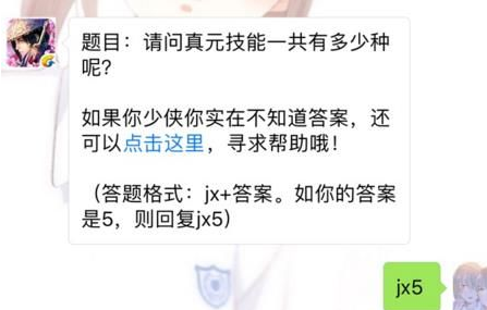 Q:剑侠情缘手游真元技能一共有多少种?(答题格式:jx答案)
