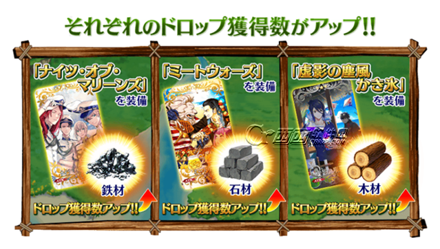 装备池内礼装,可以增加「铁材」「石材」「木材」的掉落数。