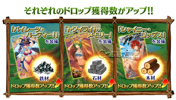 在2016年的「盛夏!碧海!开拓! FGO 2016 Summer pick up召唤2」,获得了以下礼装装备的话,也可以增加「铁材」「石材」「木材」的掉落数!