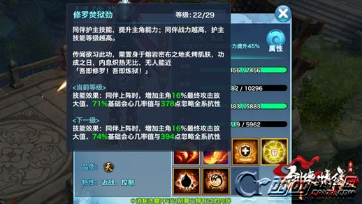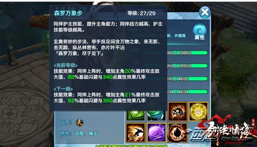 技能效果,增加主角最终攻击放大值、基础闪避、属性效果几率。