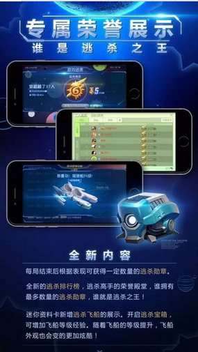 每局结束后根据表现可获得一定数量的逃杀勋章。全新的逃杀排行榜,逃杀高手的荣誉殿堂,谁拥有最多数量的逃杀勋章,谁就是逃杀之王!