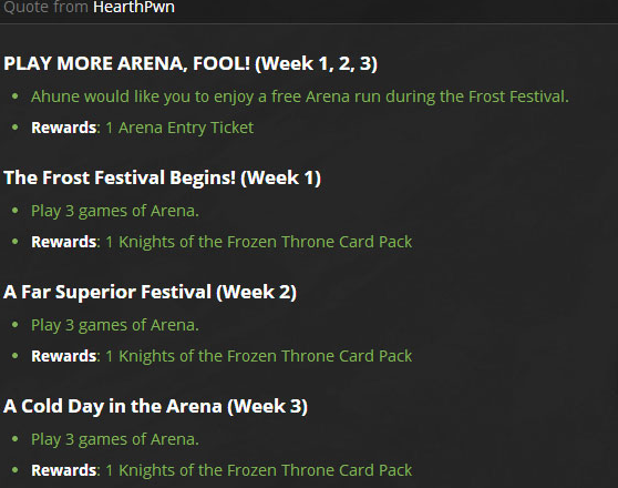 每周打完3场竞技场就送1包冰封王座的骑士卡包,一共3包;