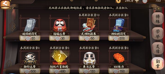 ※7月16日神龛将新增商品项[御魂礼盒],花费200御札可兑换指定位置指定种类的6星御魂1枚,每个周期限定最多兑换5枚。