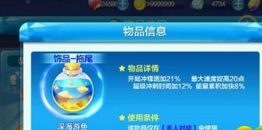 天天酷跑深海游鱼的属性是目前多人拖尾中最好的的之一,天天酷跑深海游鱼的入手价值还是非常高的。而且深海游鱼是活动获取,玩家只要坚持玩经典和极速模式收集掉落道具,就能免费获得深海游鱼。